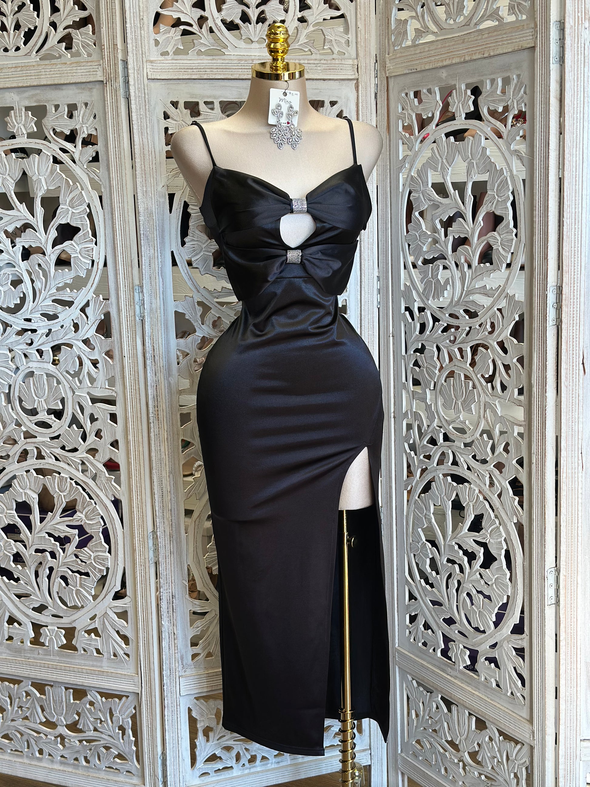 Rhinestone Bow Black Dress- Stretchy,Estira