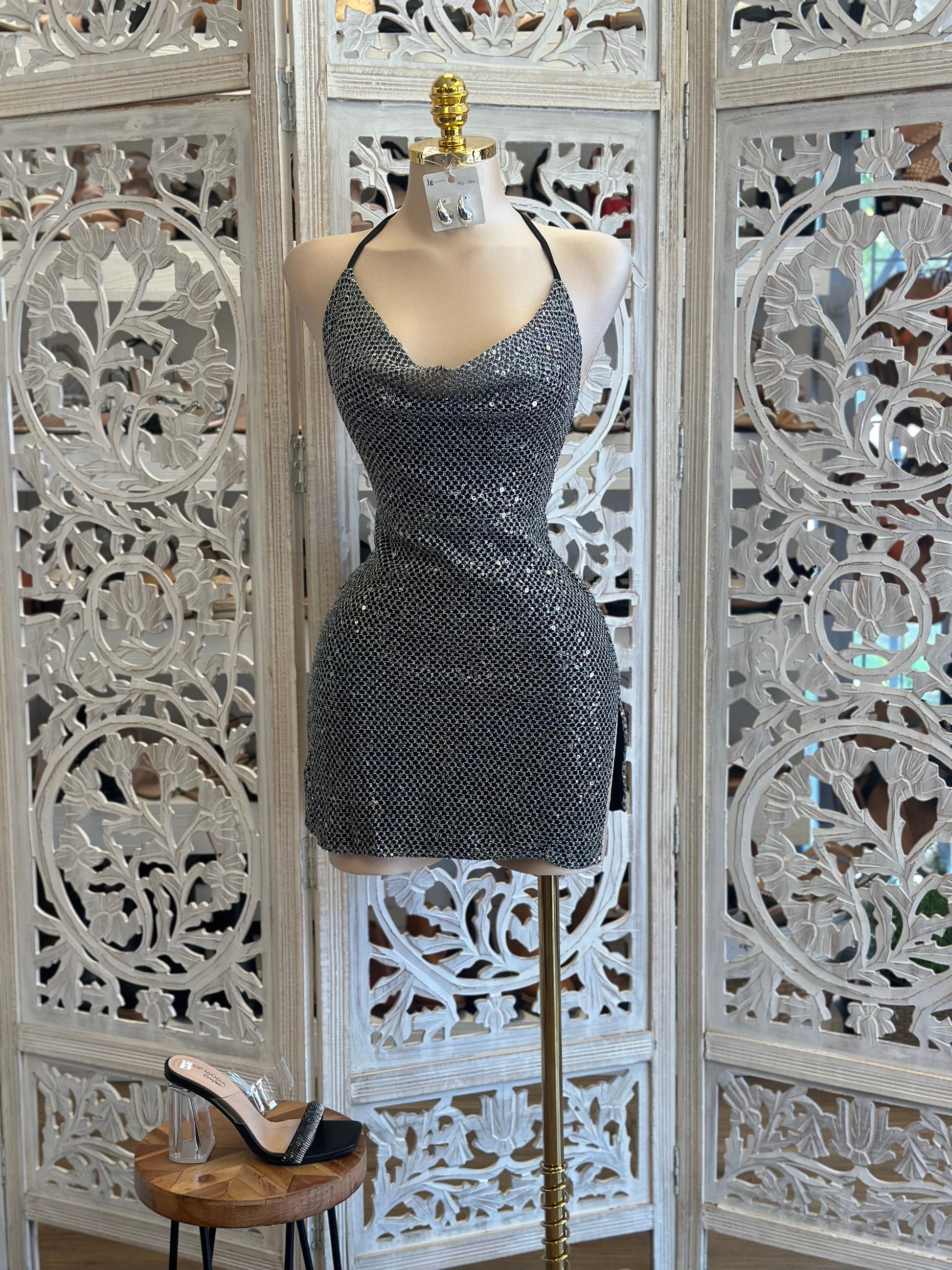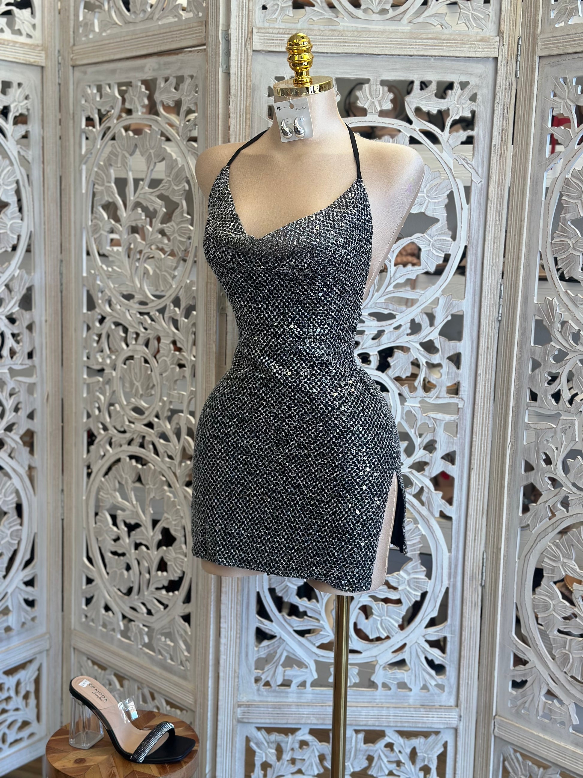 Rhinestone Cowl Neck Mini Dress- Stretchy , Estira