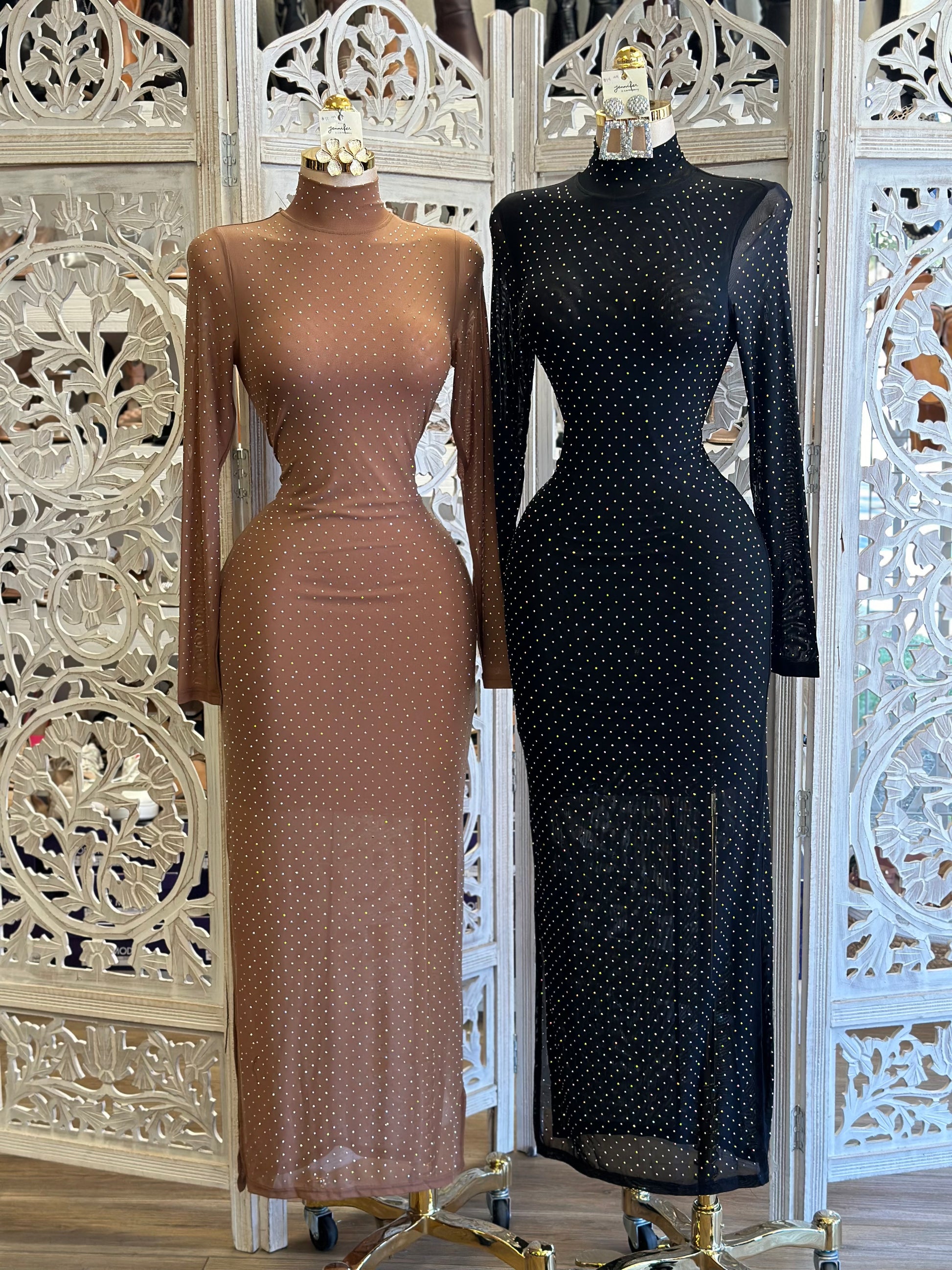 Rhinestone Mock Neck Maxi Dress- Estira, Stretchy