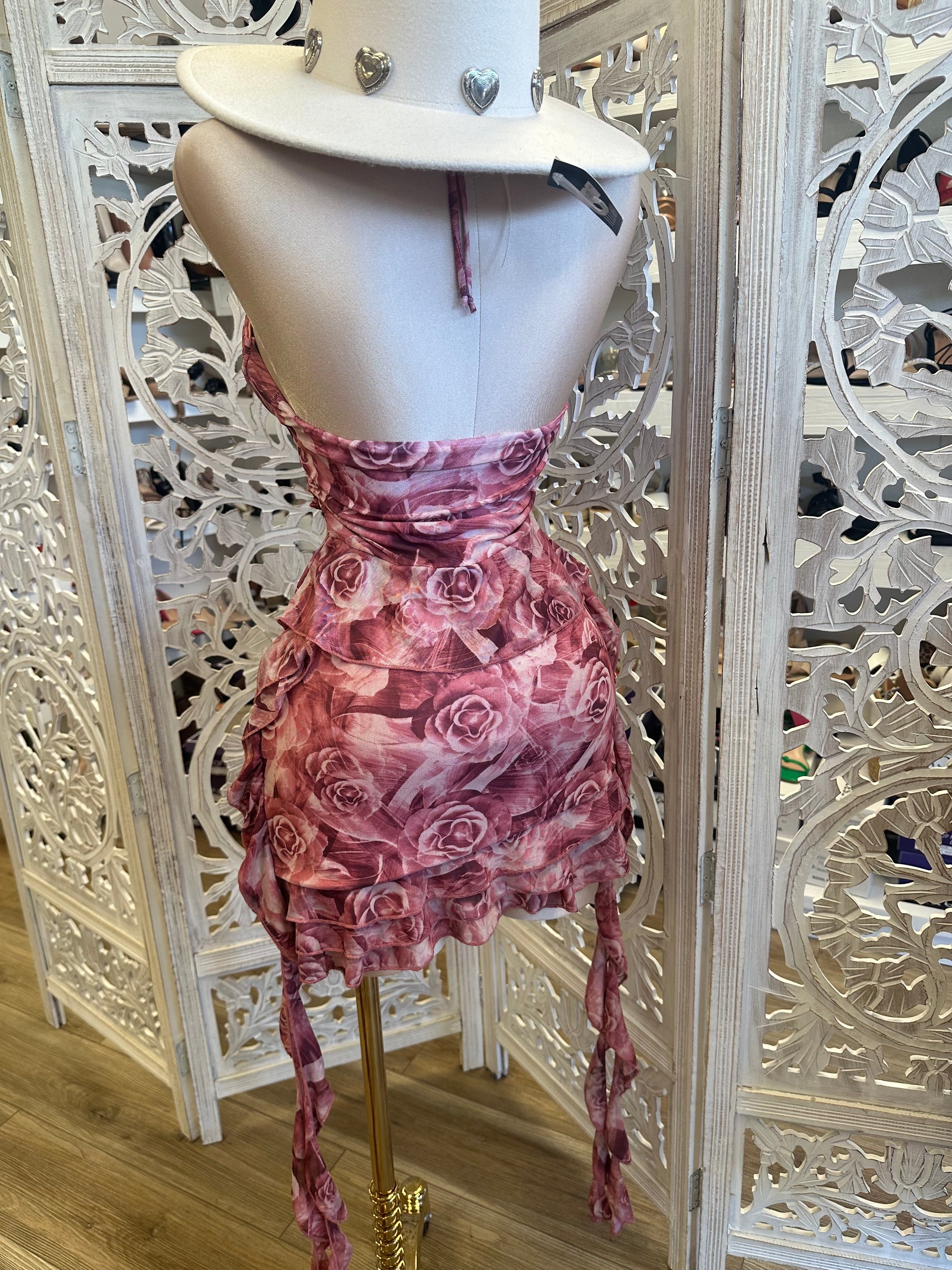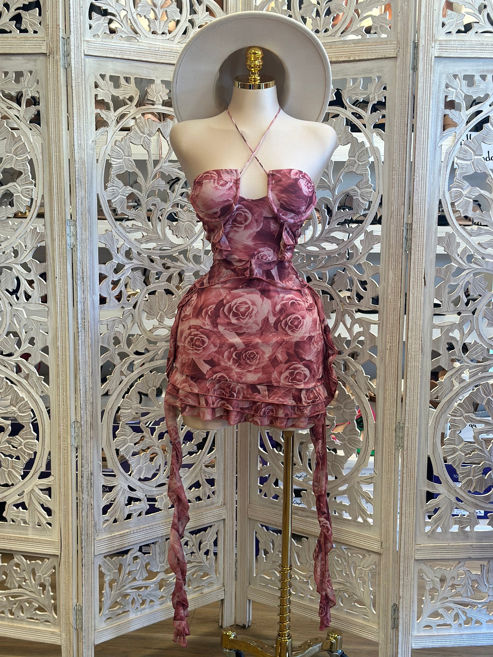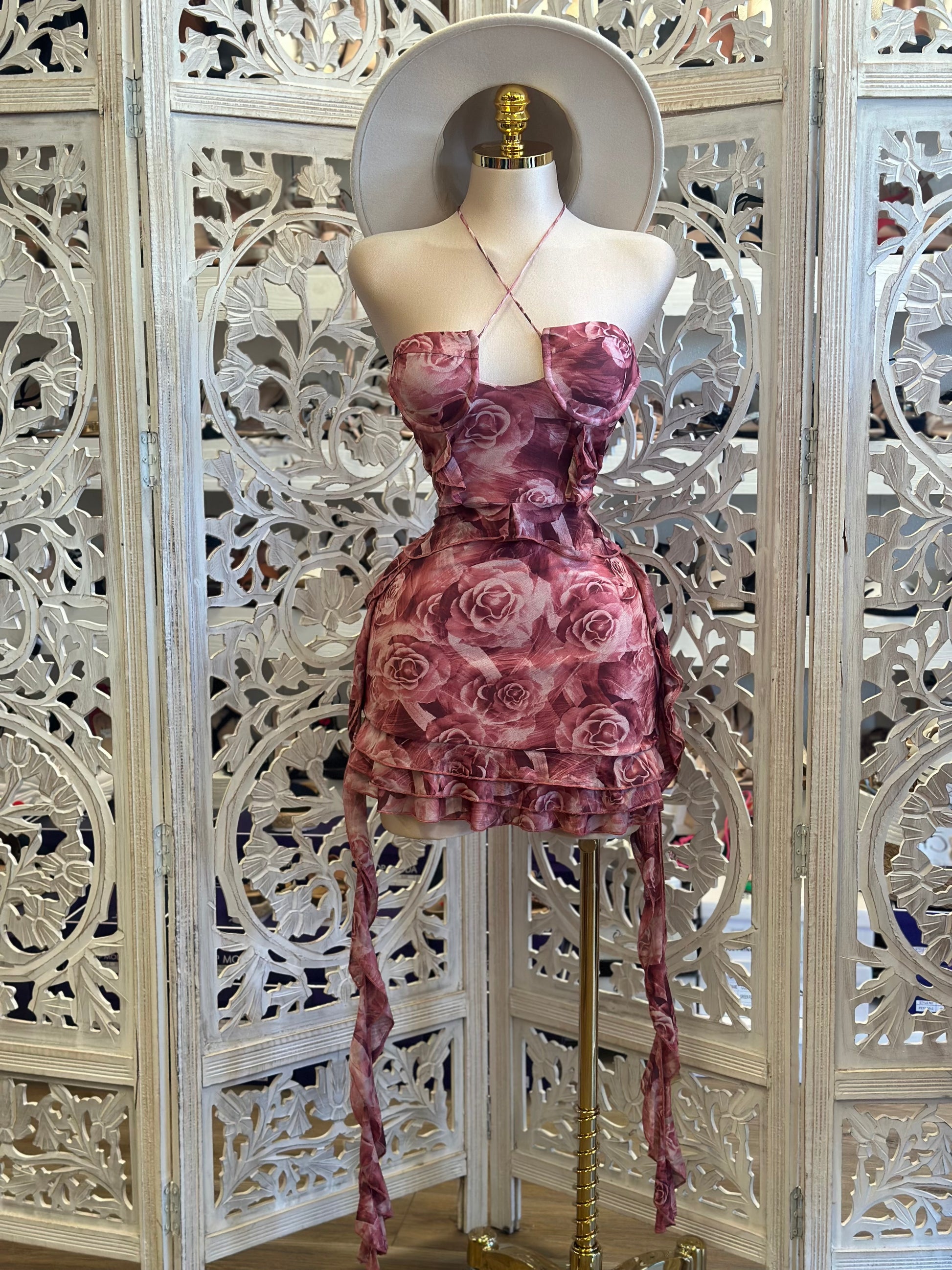 Rose Print Crossed Mini Dress- Stretchy, Estira