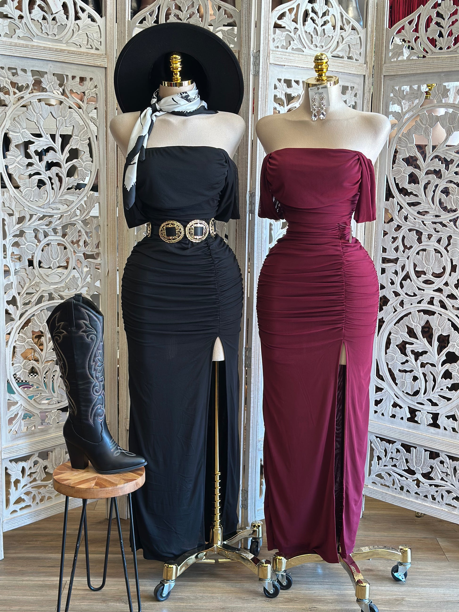 Ruched Off Shoulder High Slit Dress- Stretchy,Estira