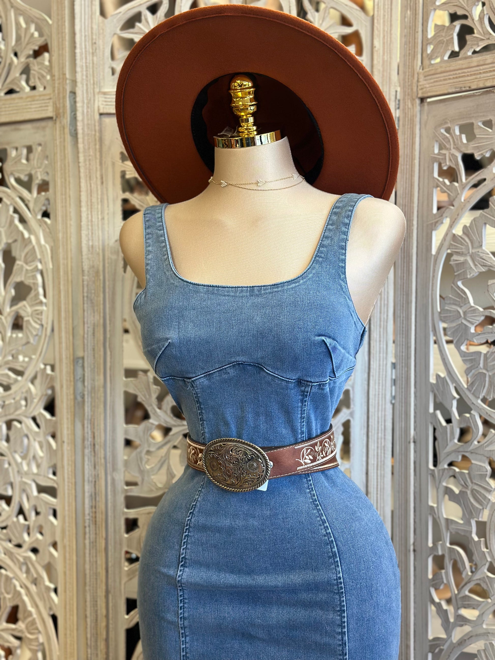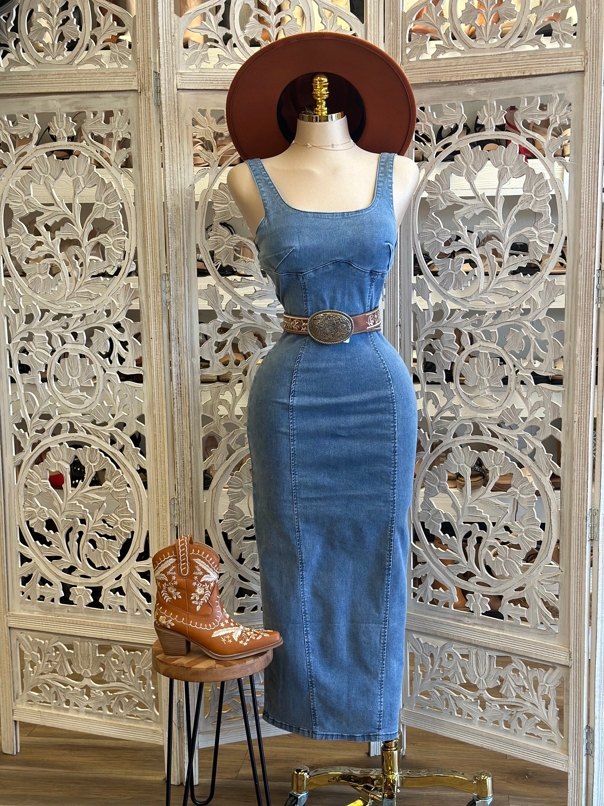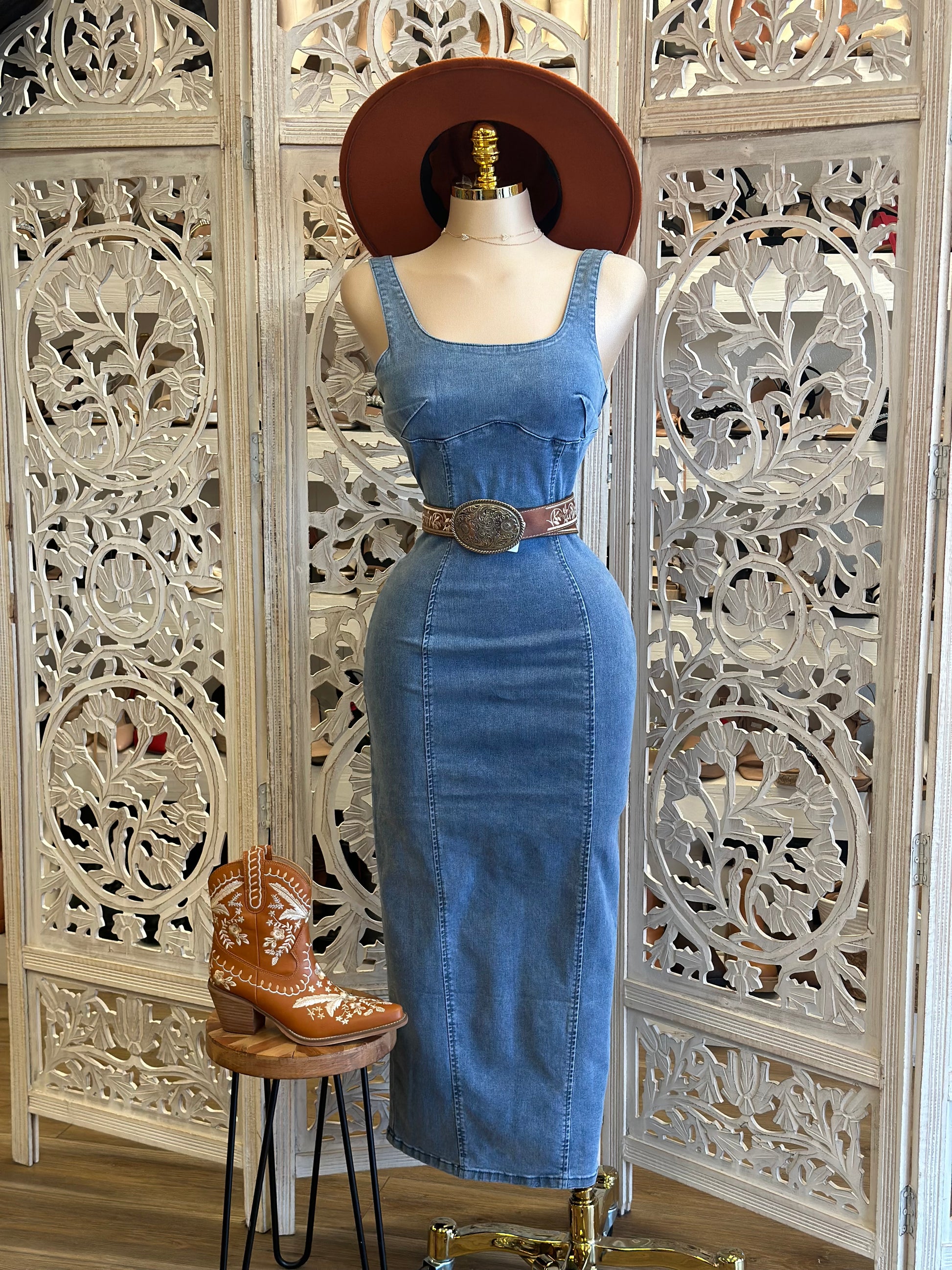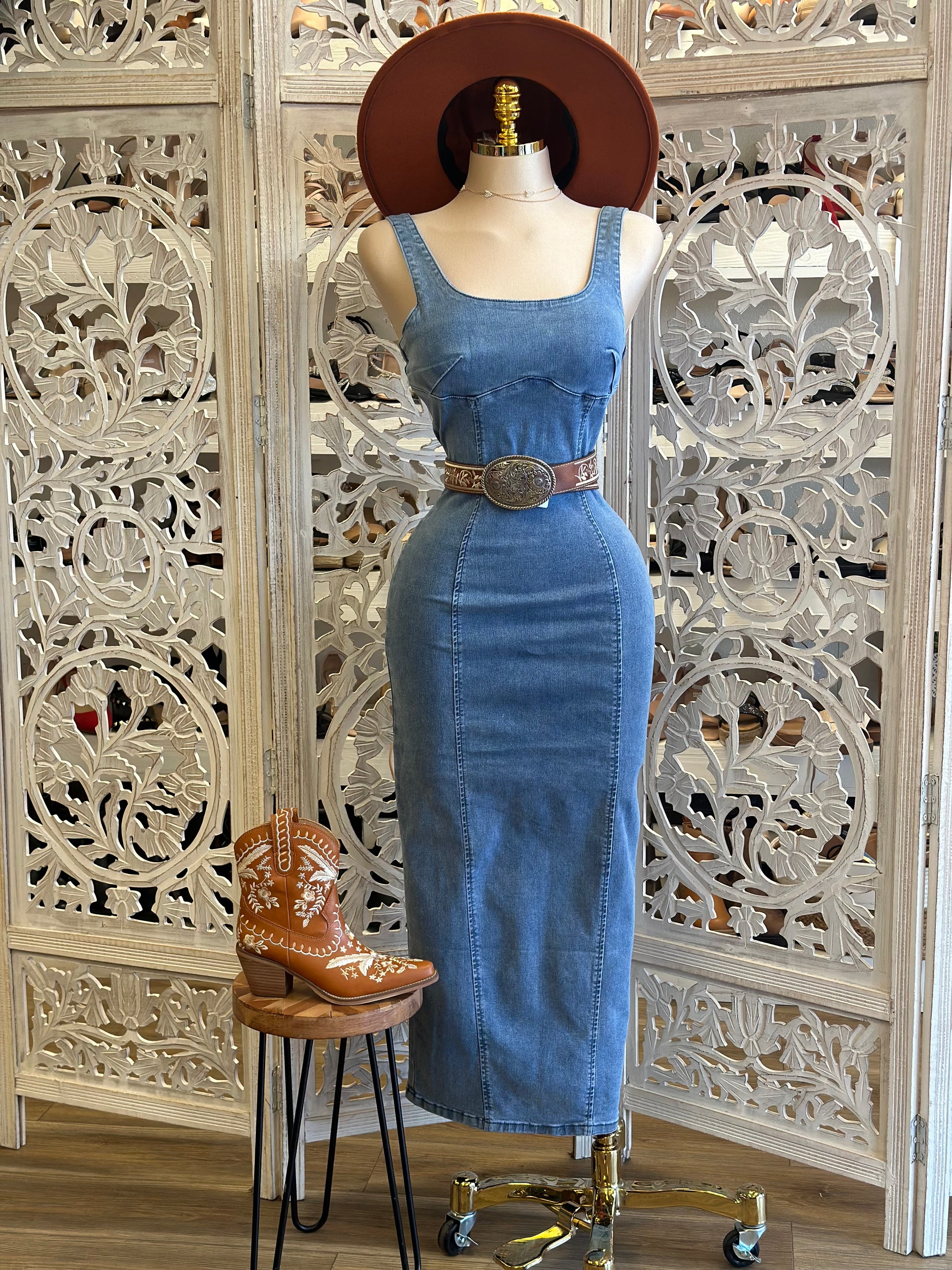 Scoop Back Denim Midi Dress - Estira Poco, Slightly Stretchy
