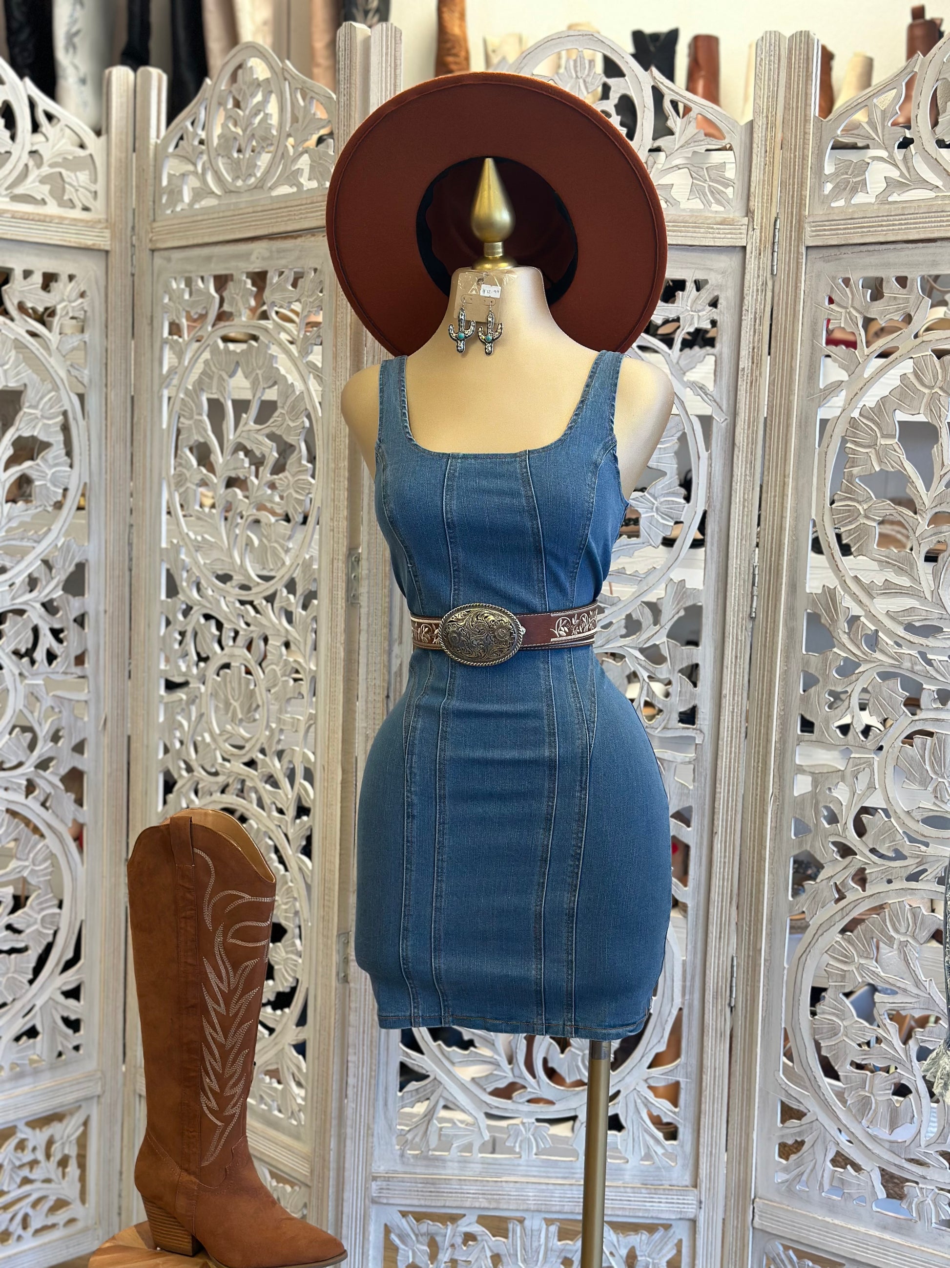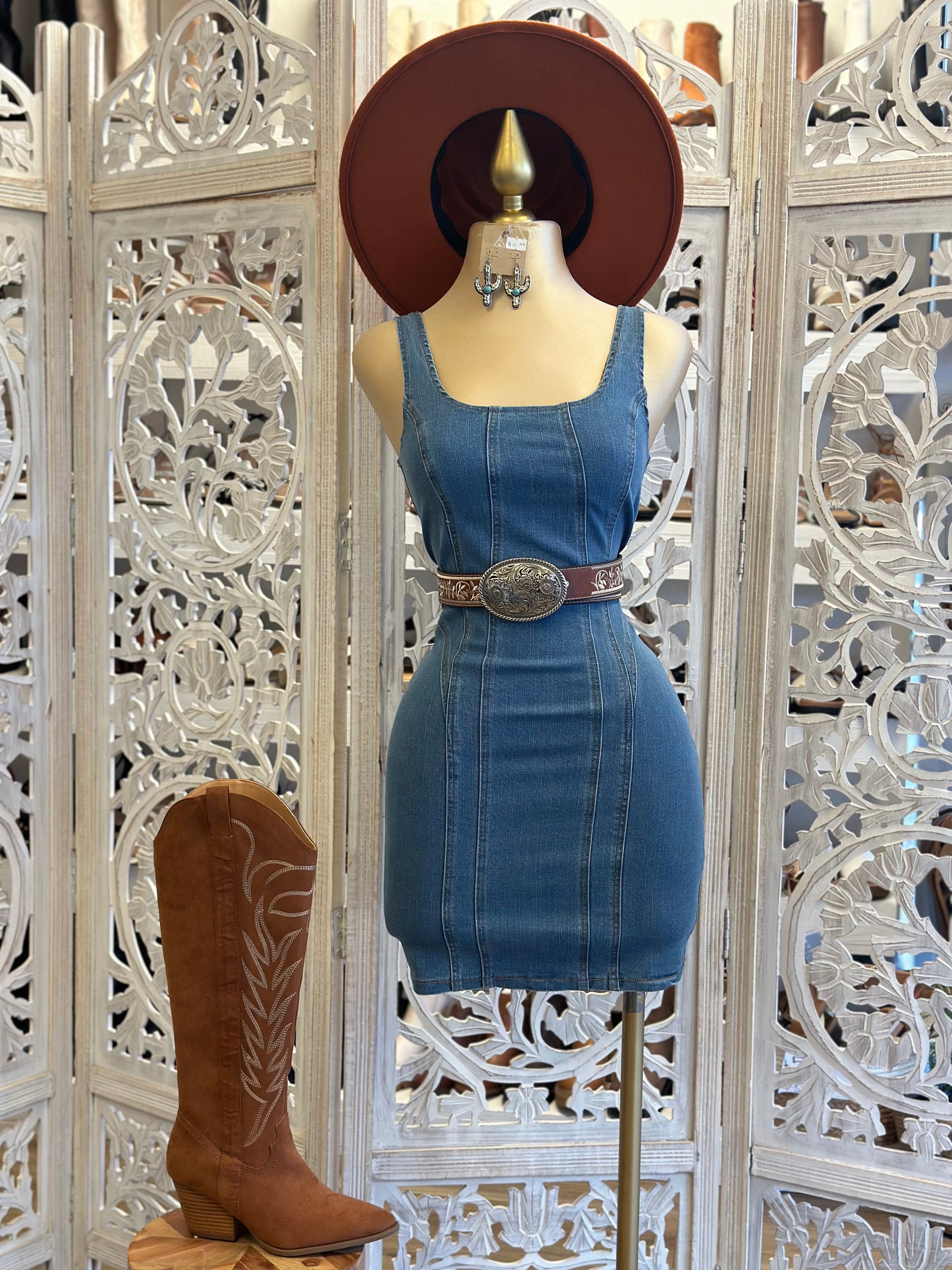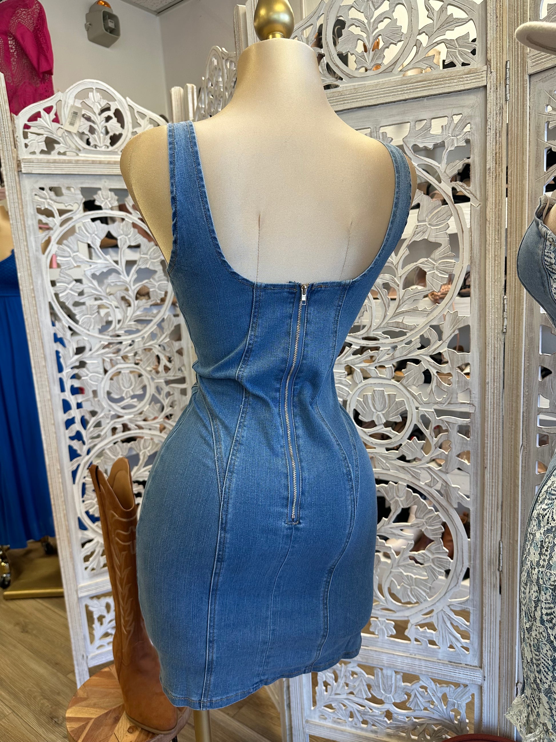 Scoop Back Denim Mini Dress - Estira, Stretchy