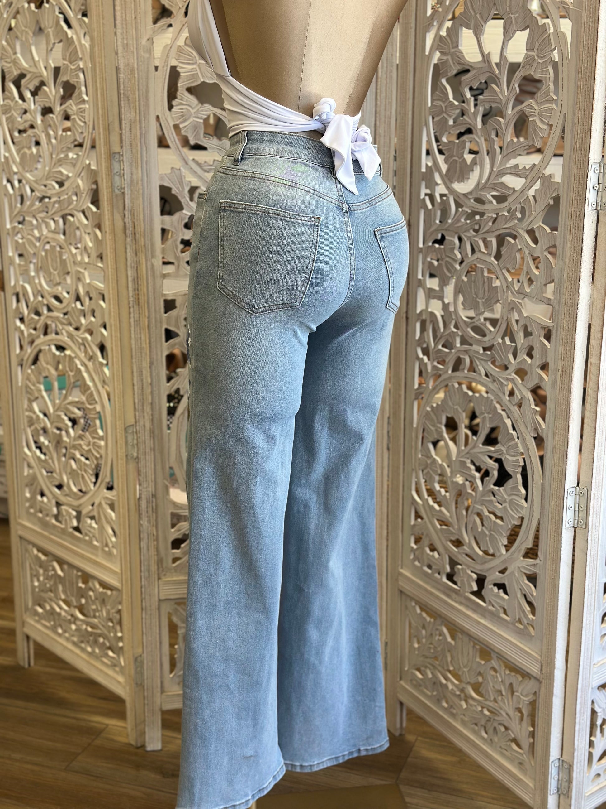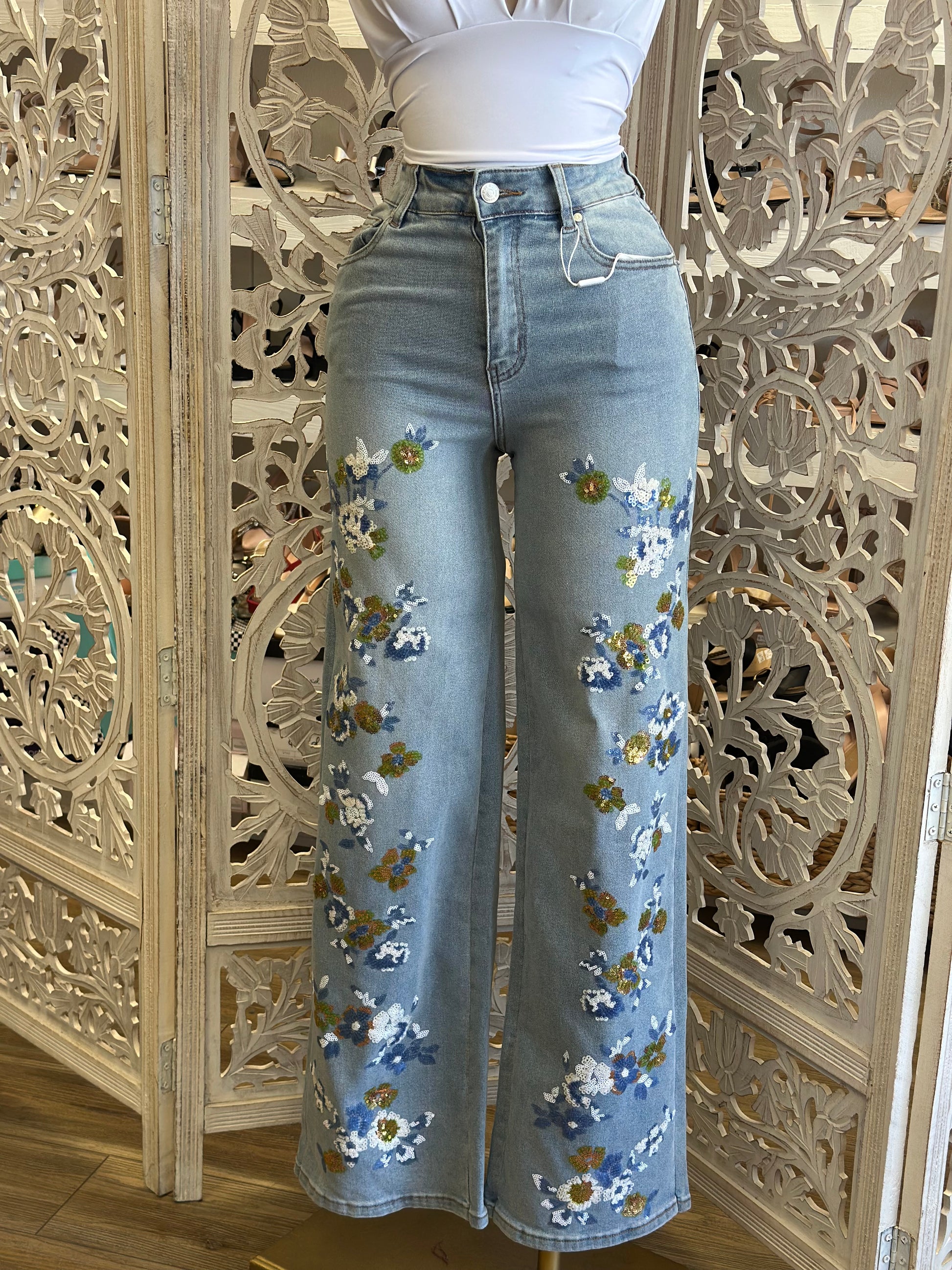Sequin Floral Denim Wide Jeans - Stretchy, Estira