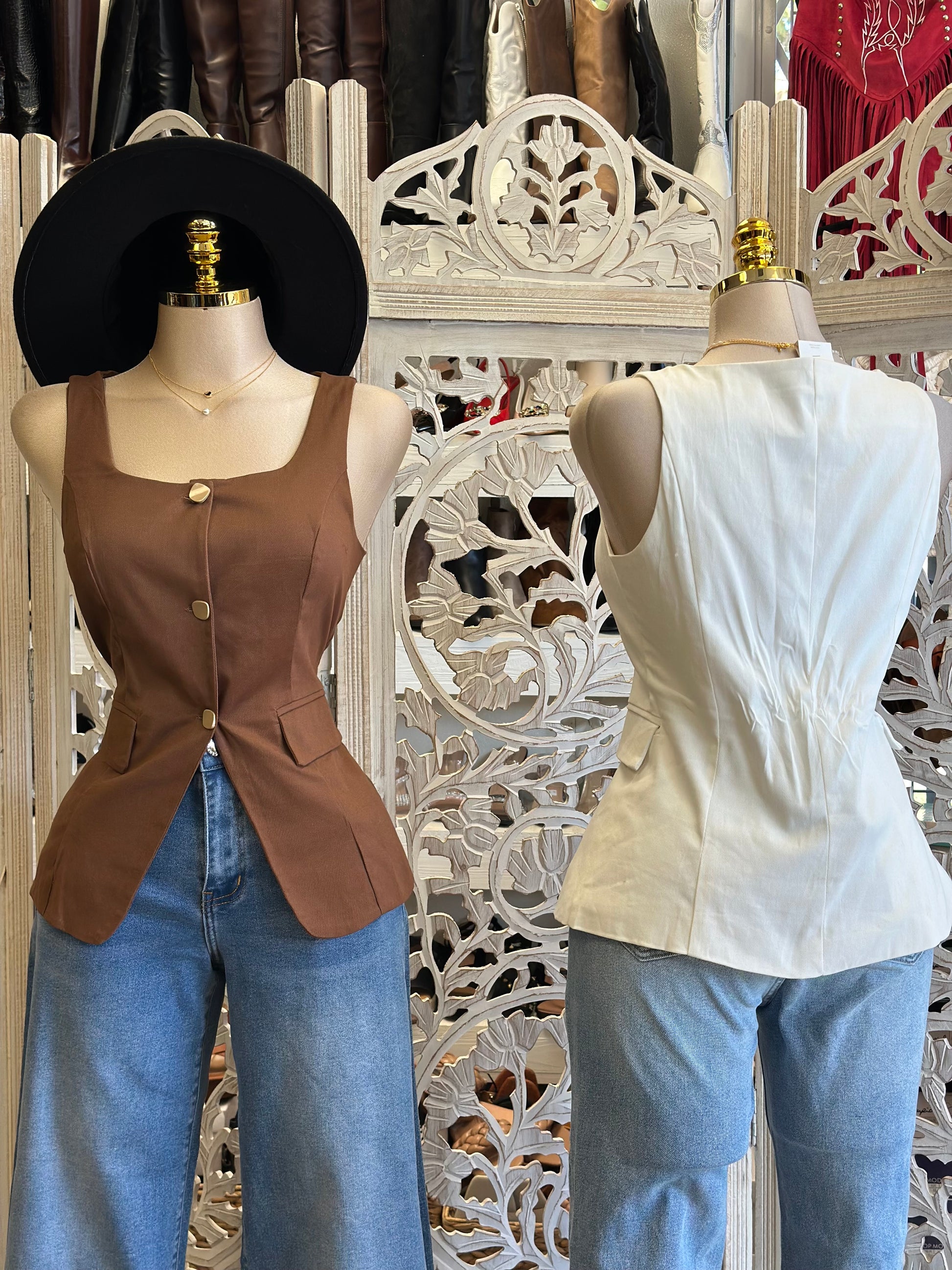 Square Beck Gold Button Blouse Top- Estira, Stretchy