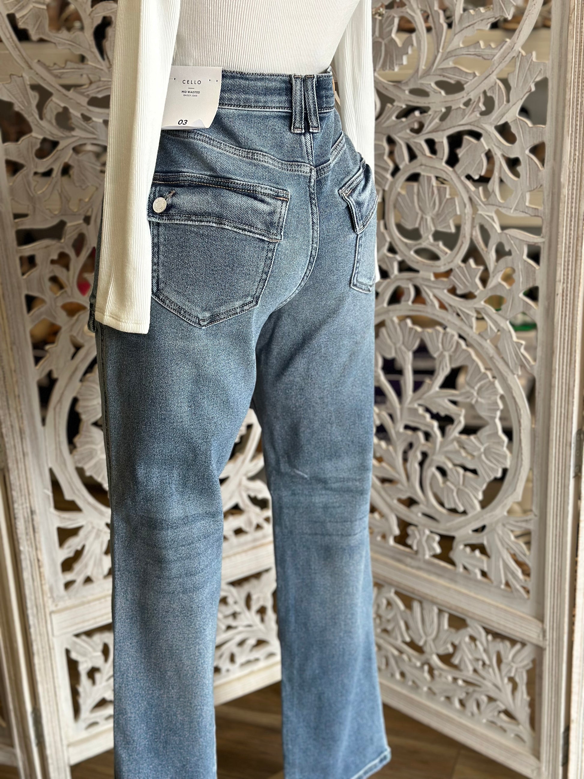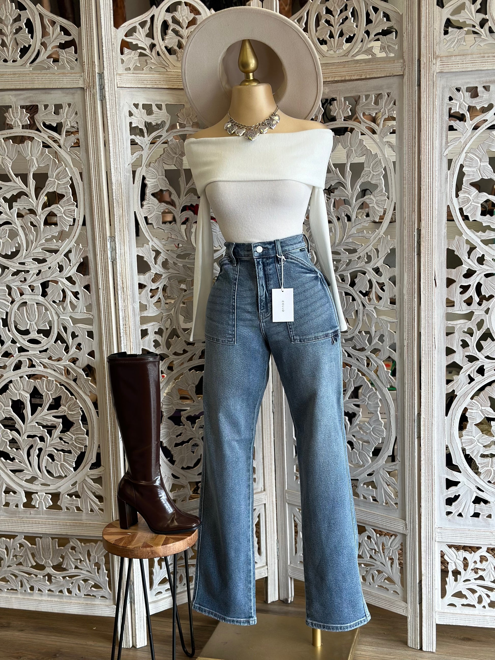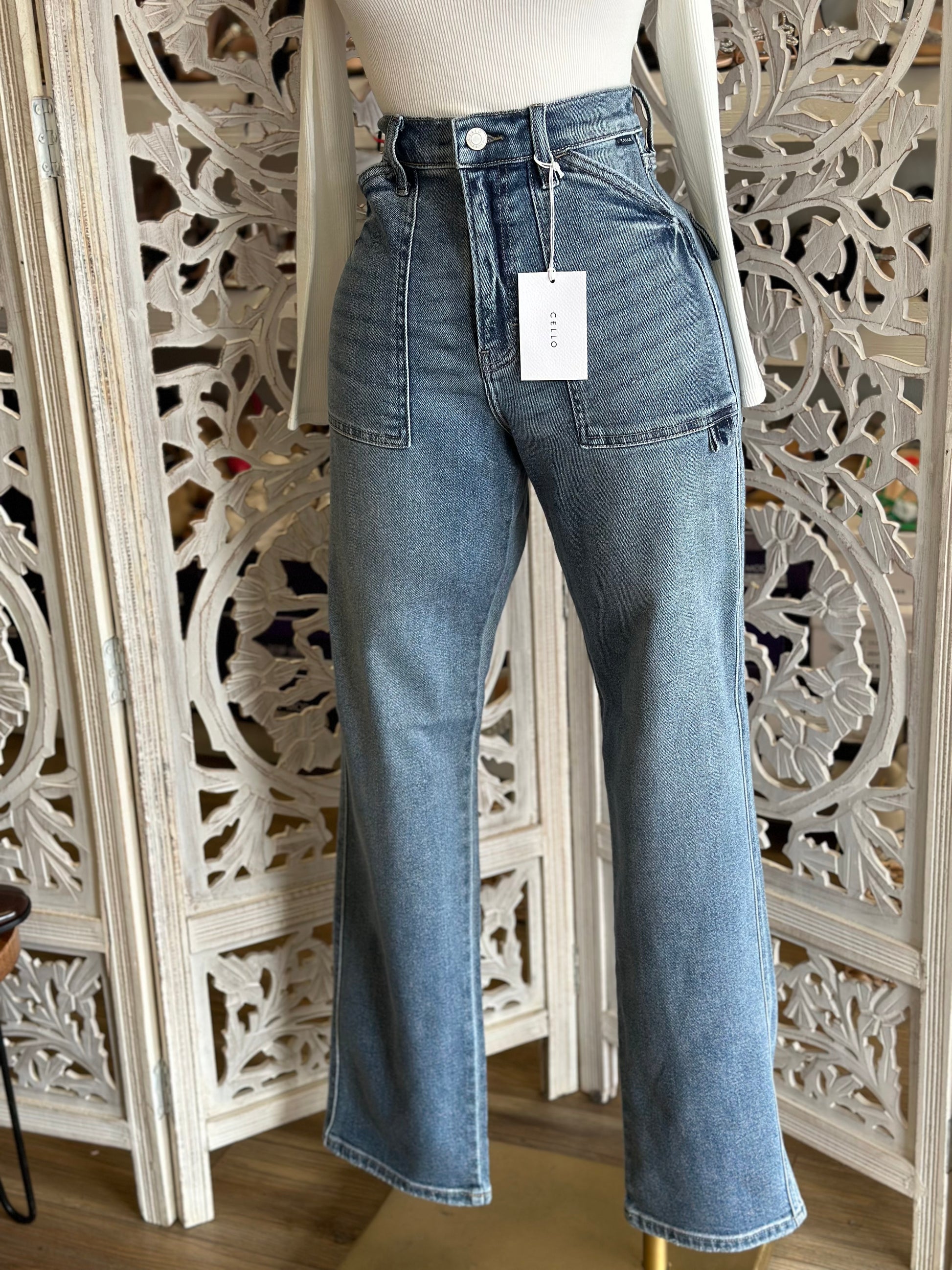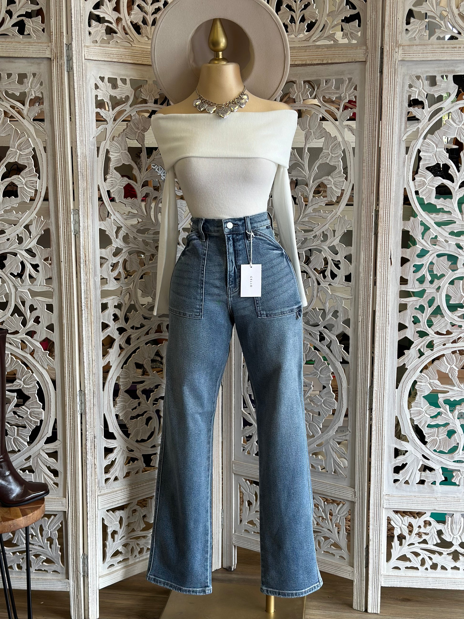 Square Pocket Denim Wide Leg Jeans - Stretchy, Estira
