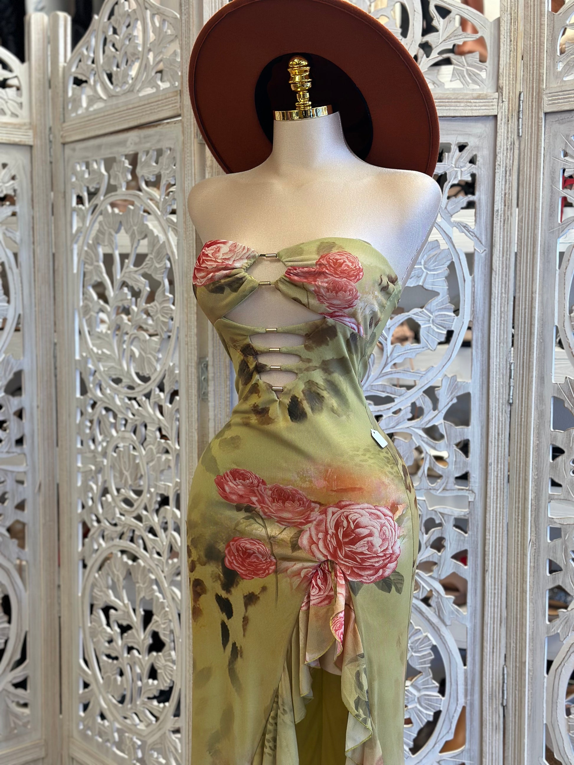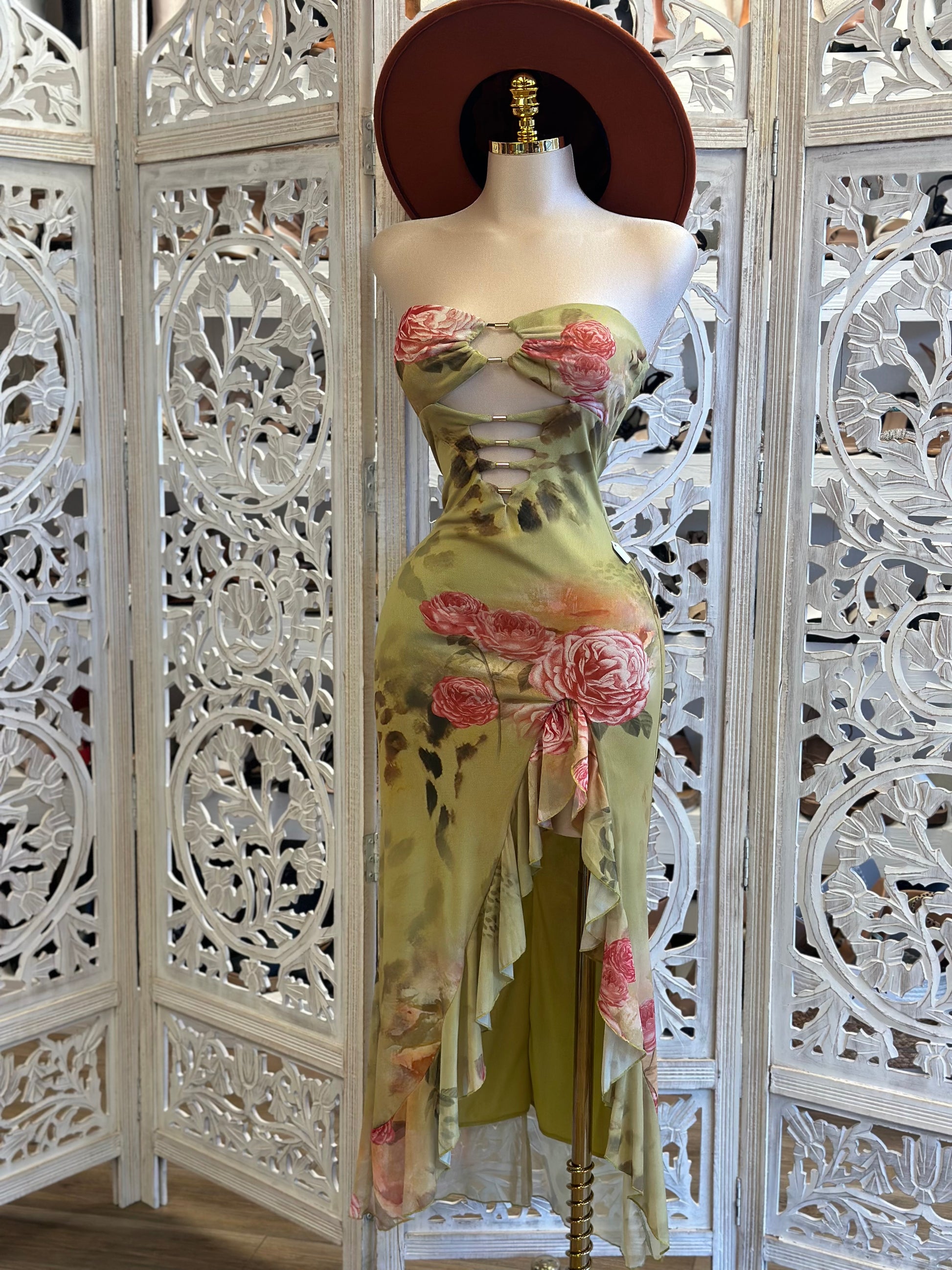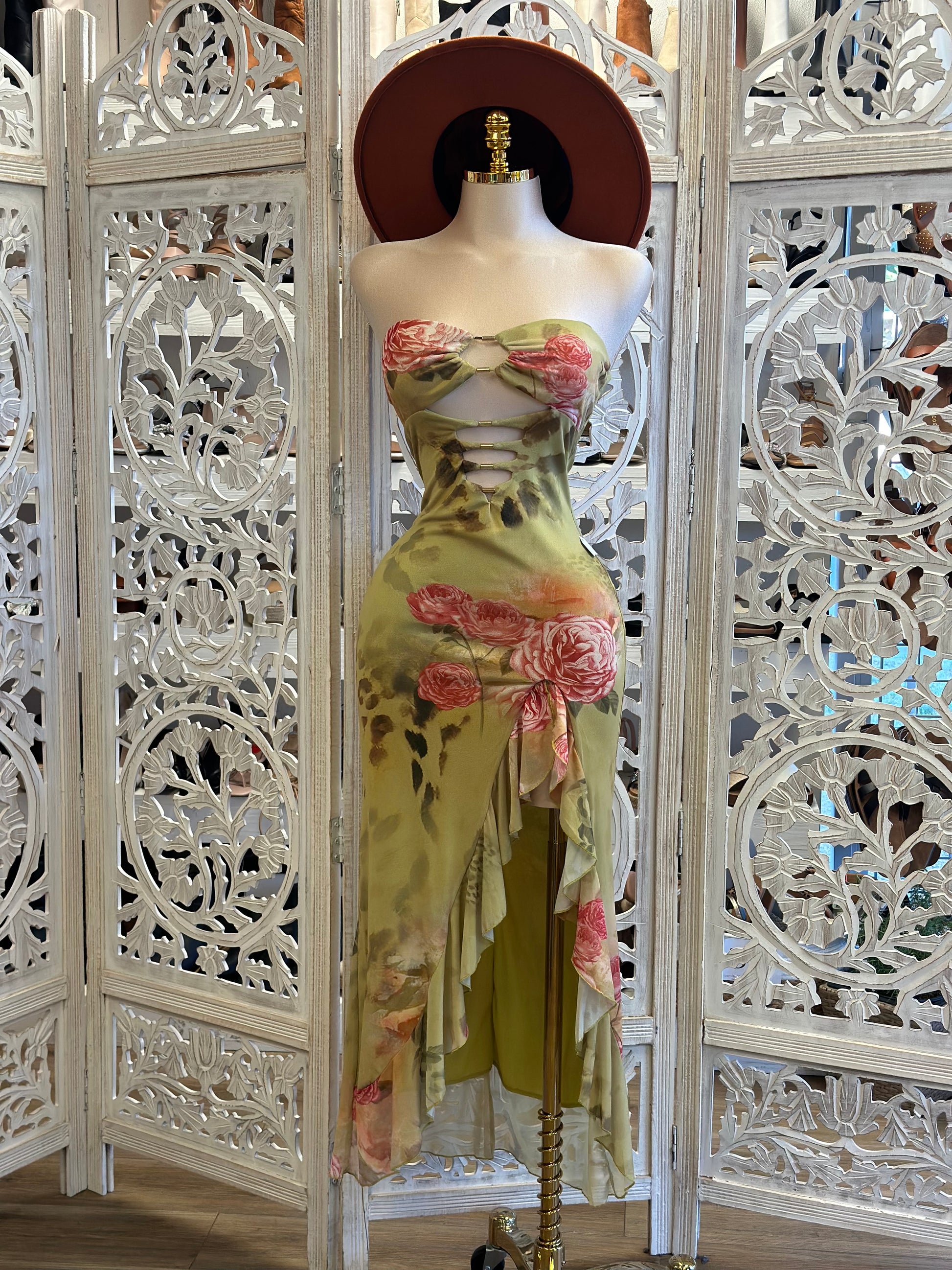 Strapless Green Cutout Ruffle Dress - Estira, Stretchy