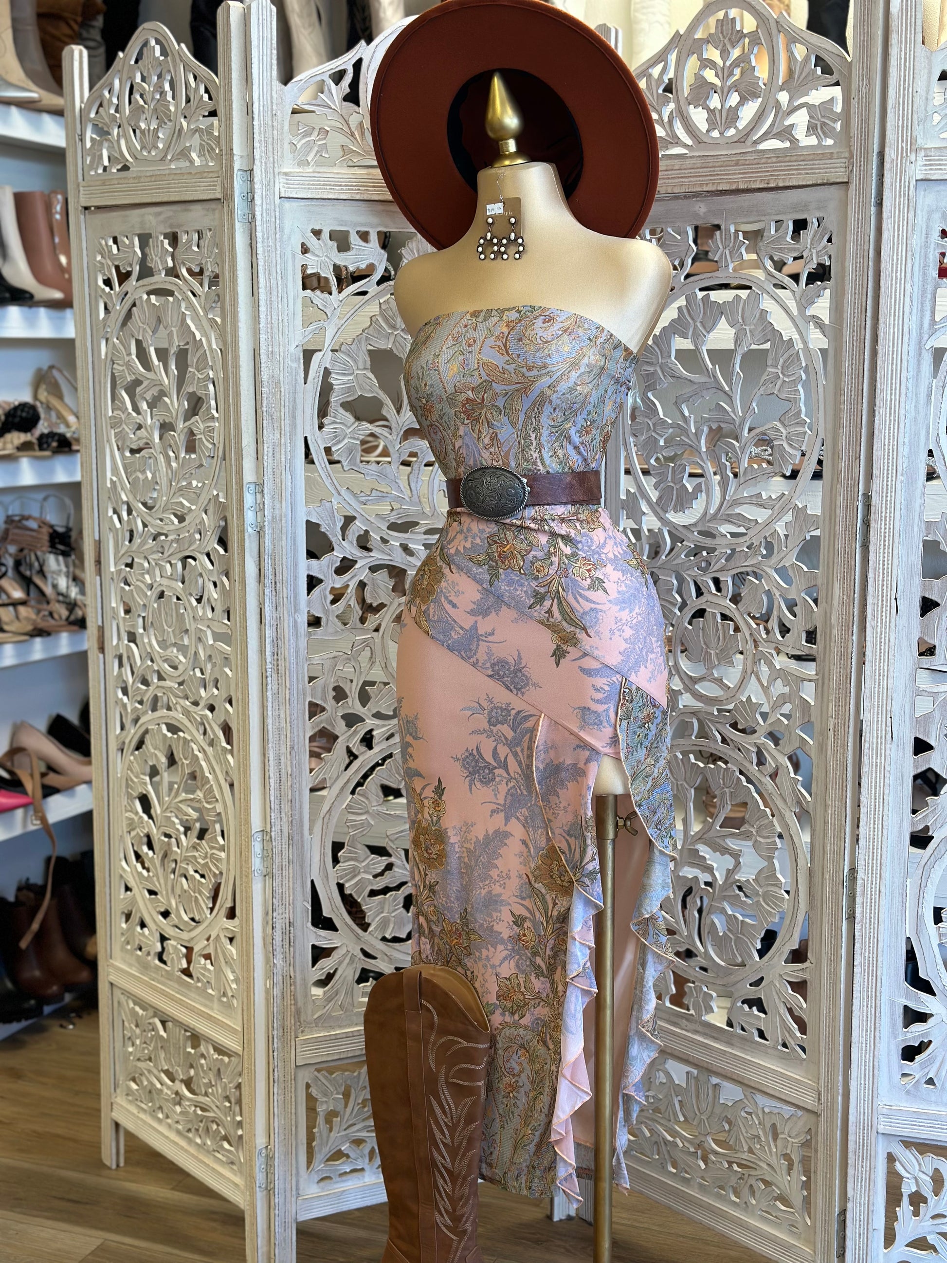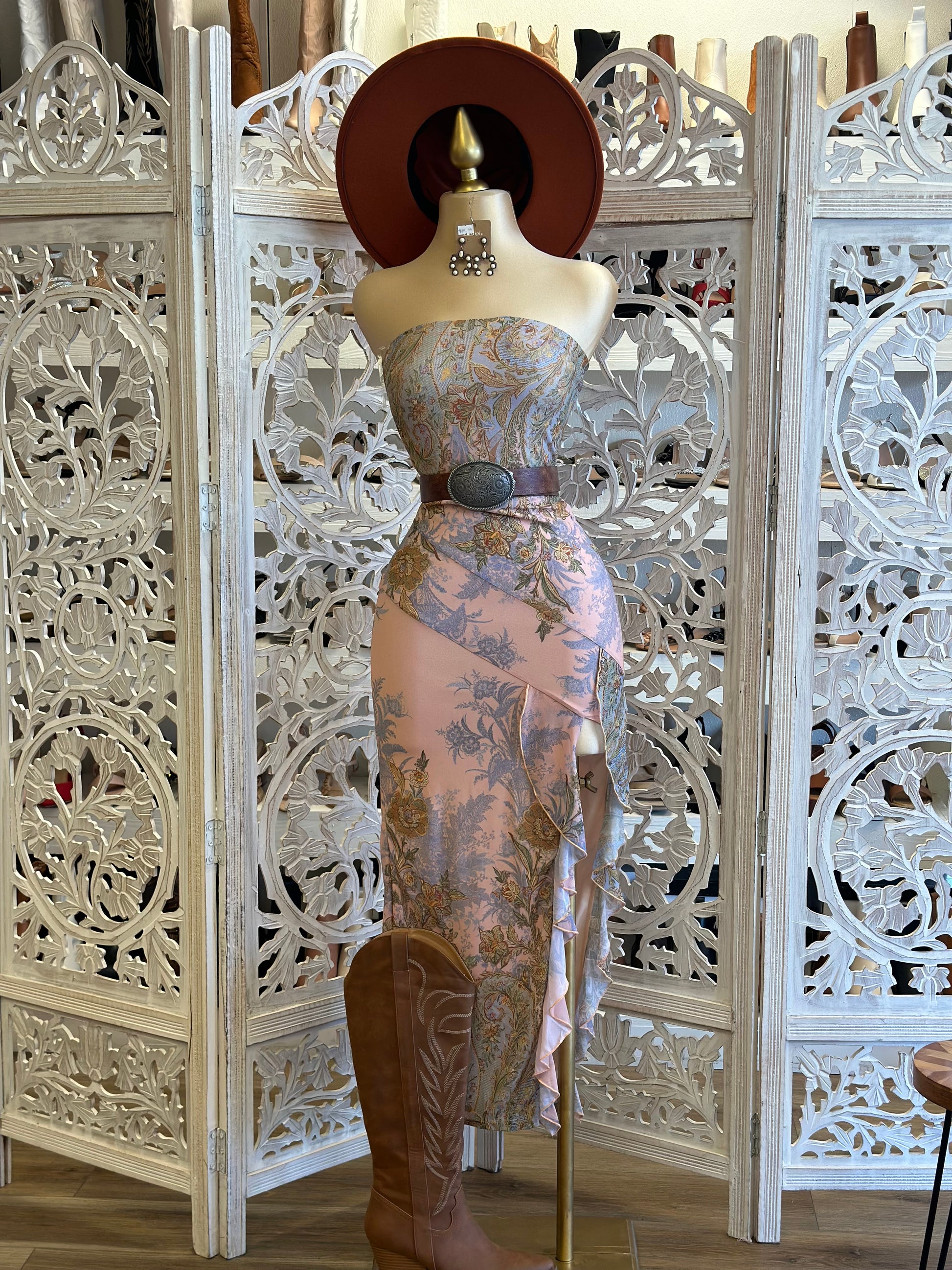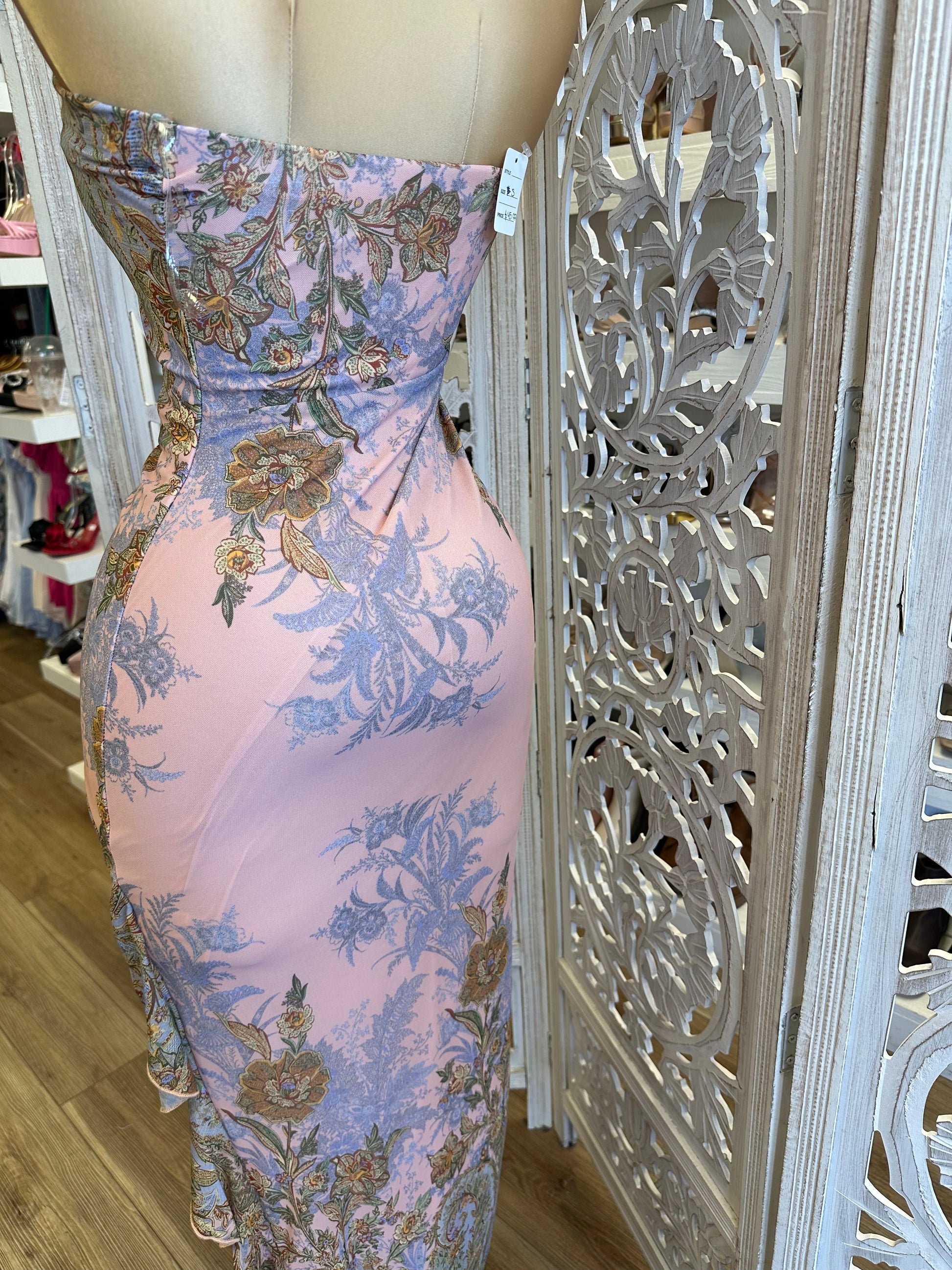 Strapless Pattern Ruffle Slit Dress- Stretchy