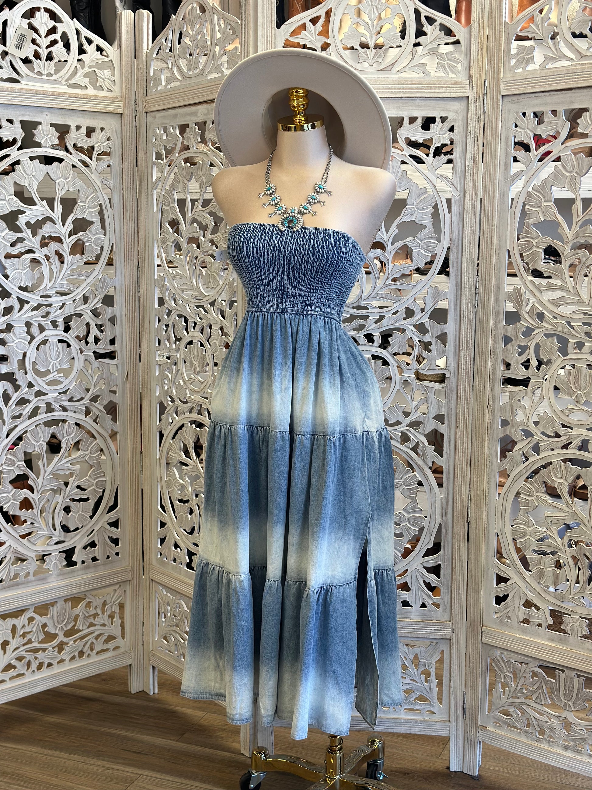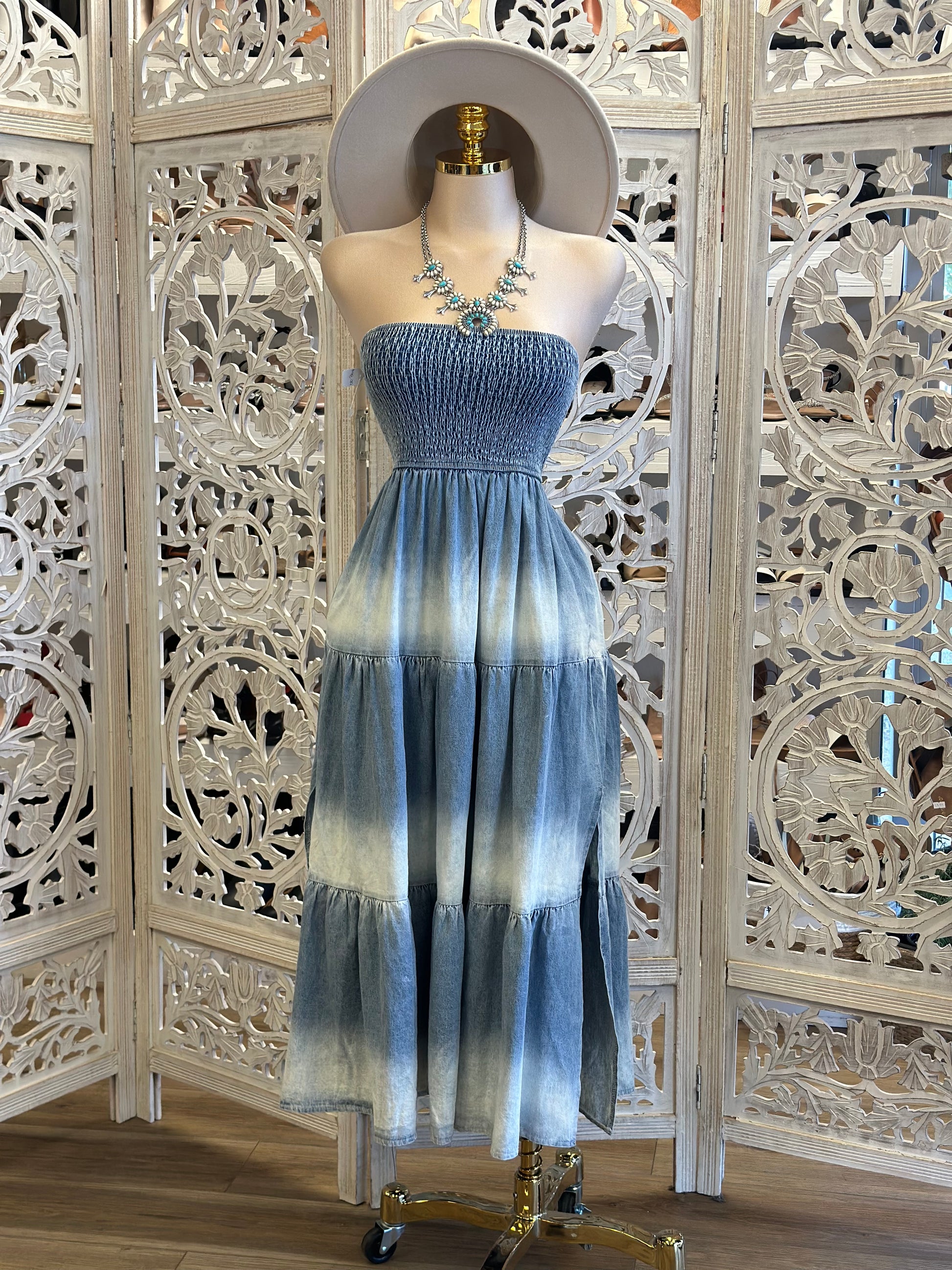 Strapless Smocked Denim Ombree Dress - Estira, Stretchy