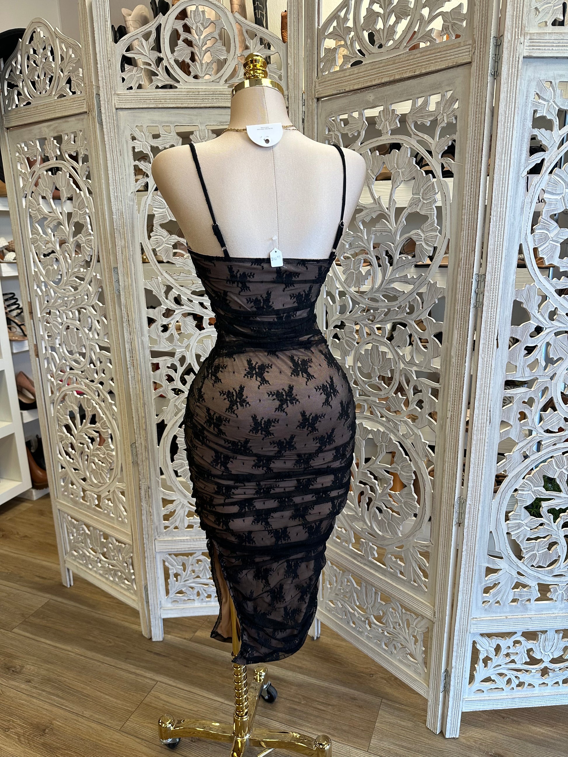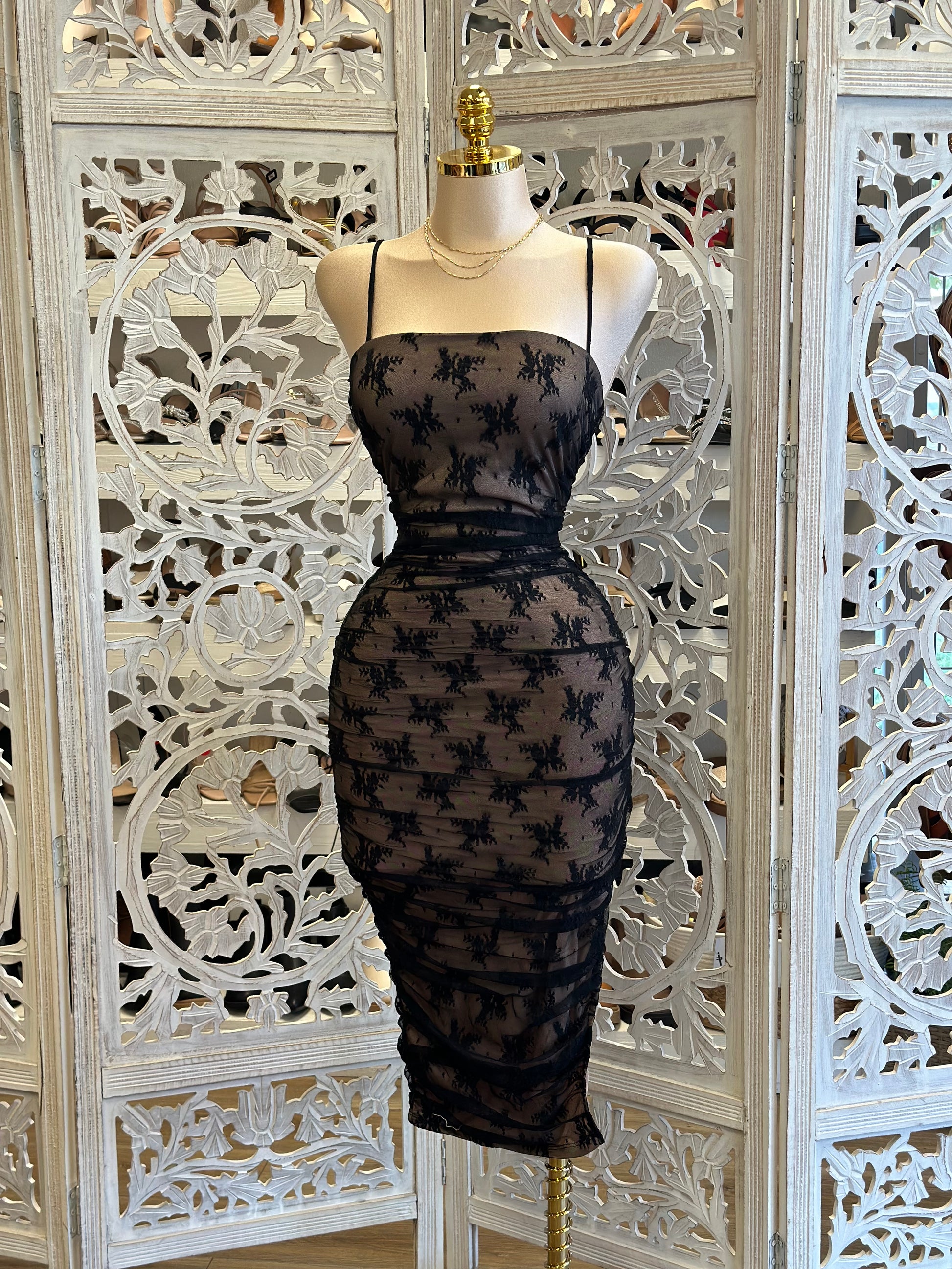 Thin Strap Black Lace Midi Dress- Stretchy,Estira