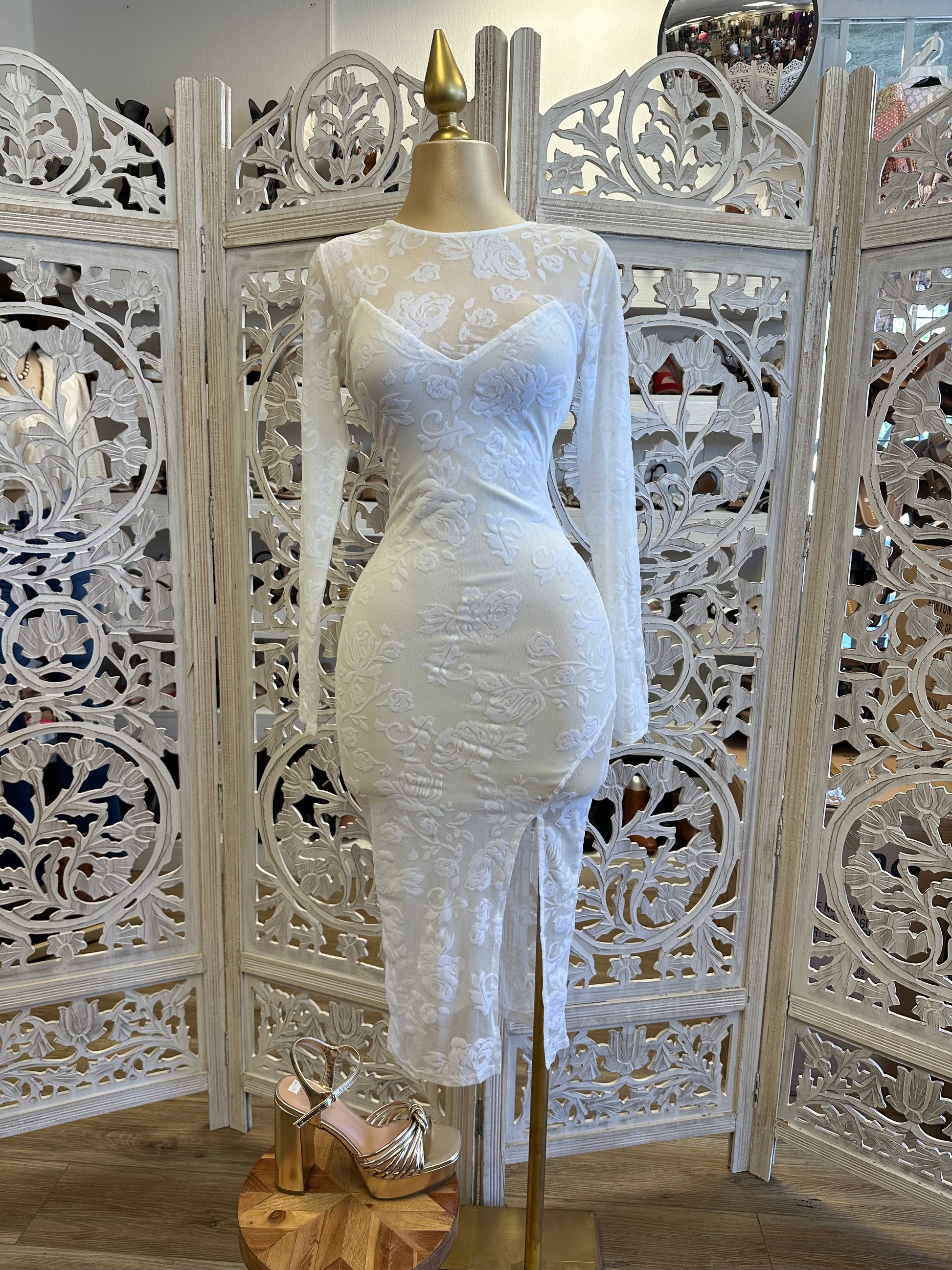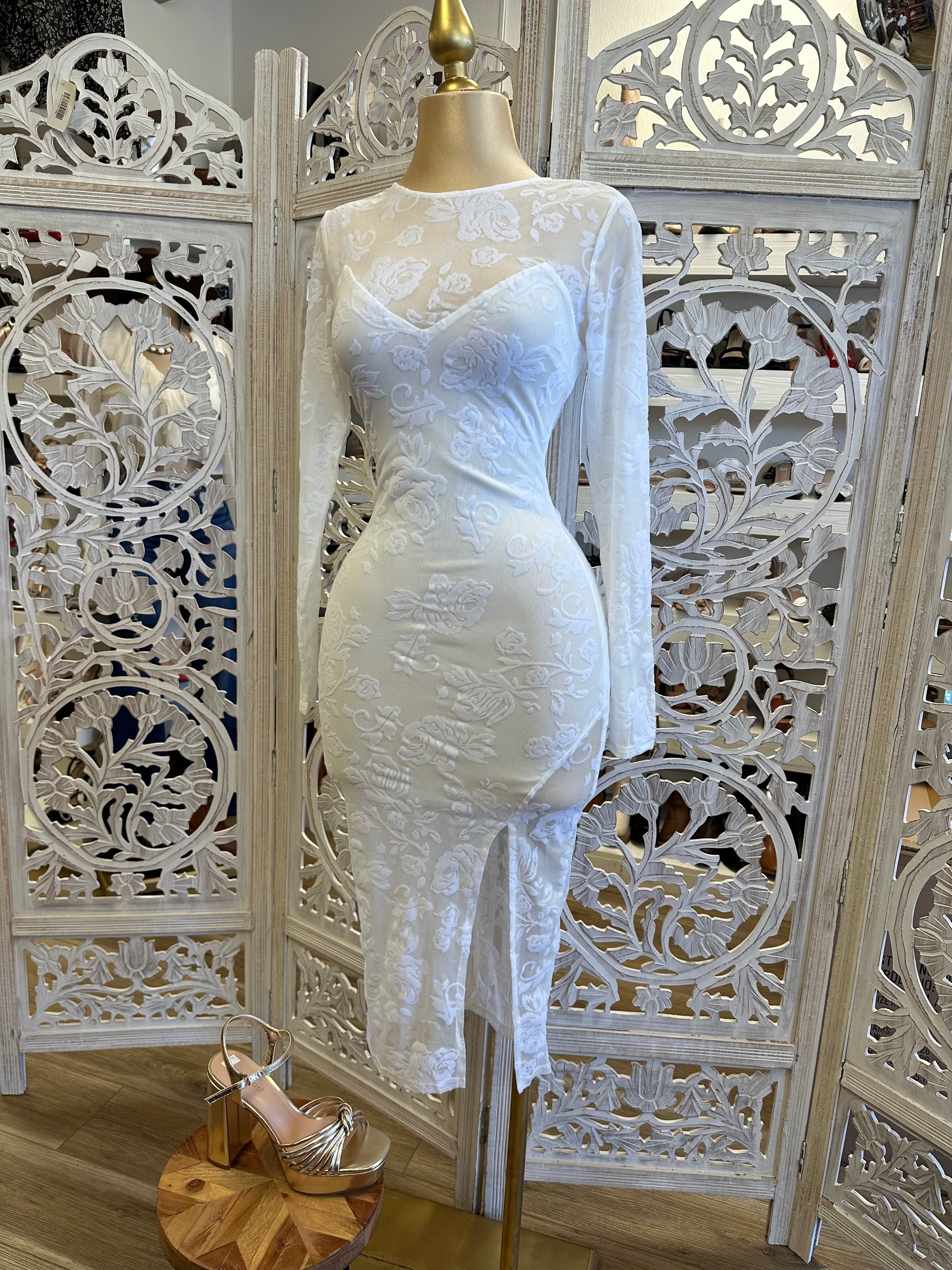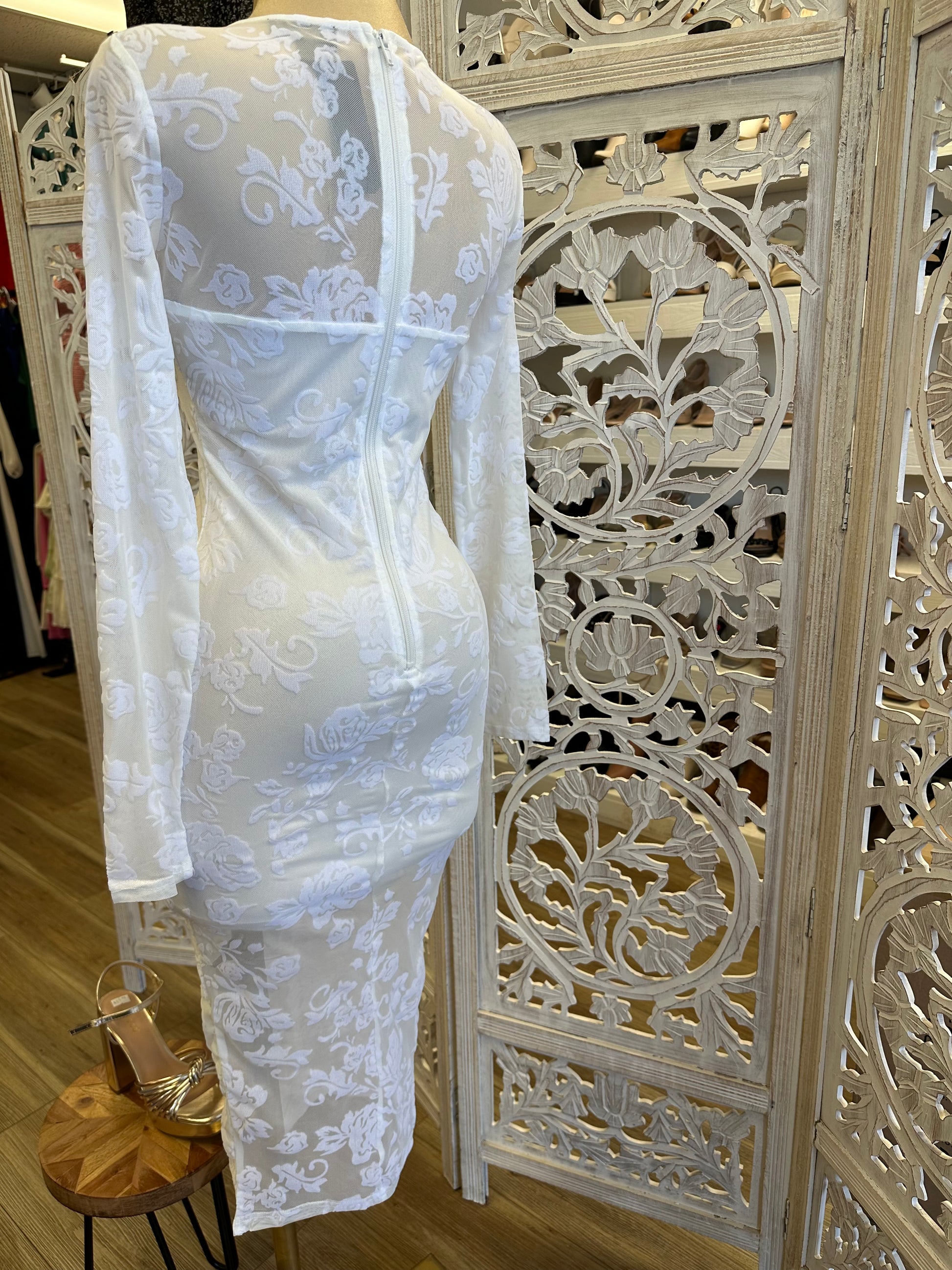 White Flower Mesh Slit Midi Dress- Stretchy