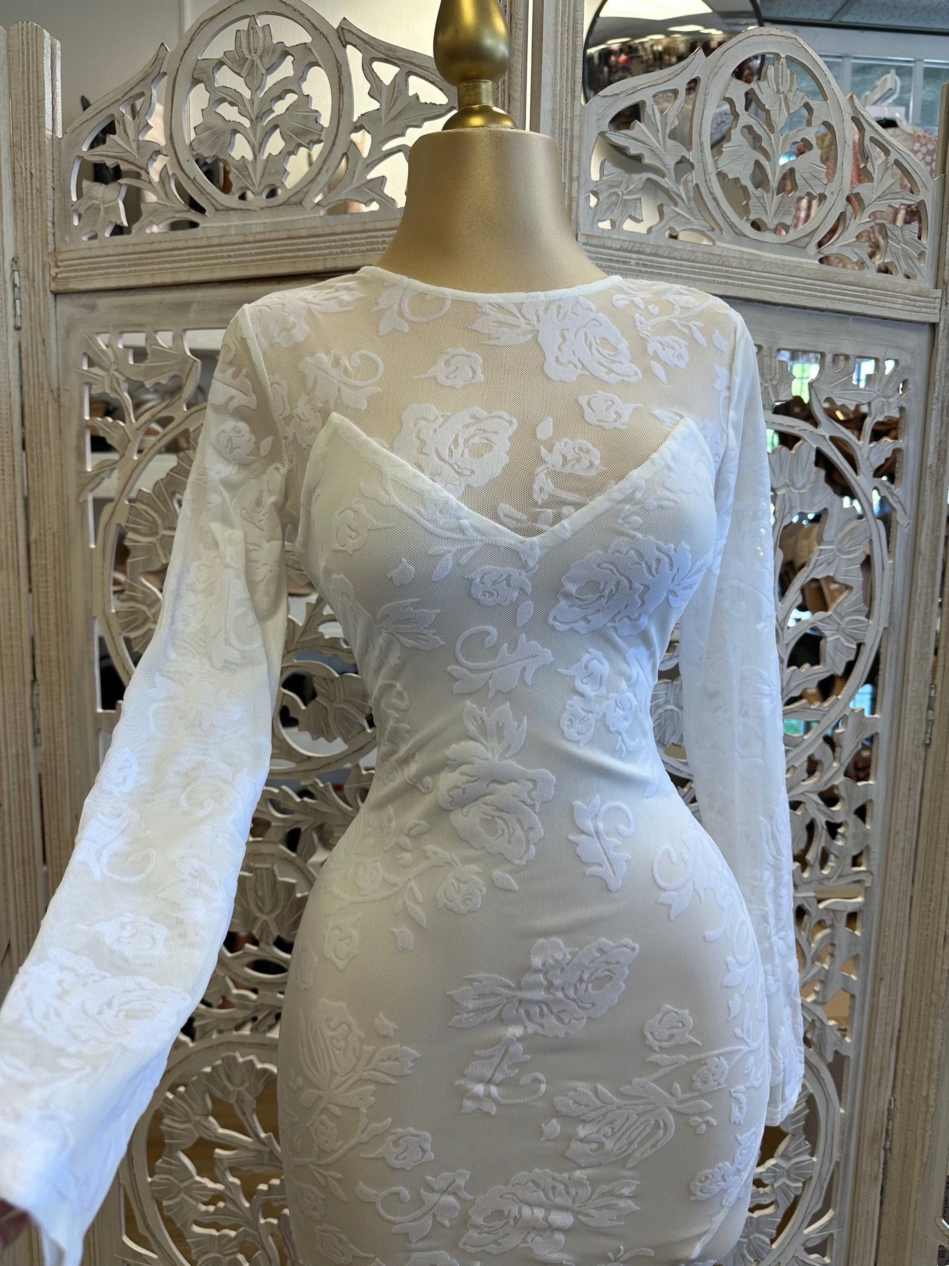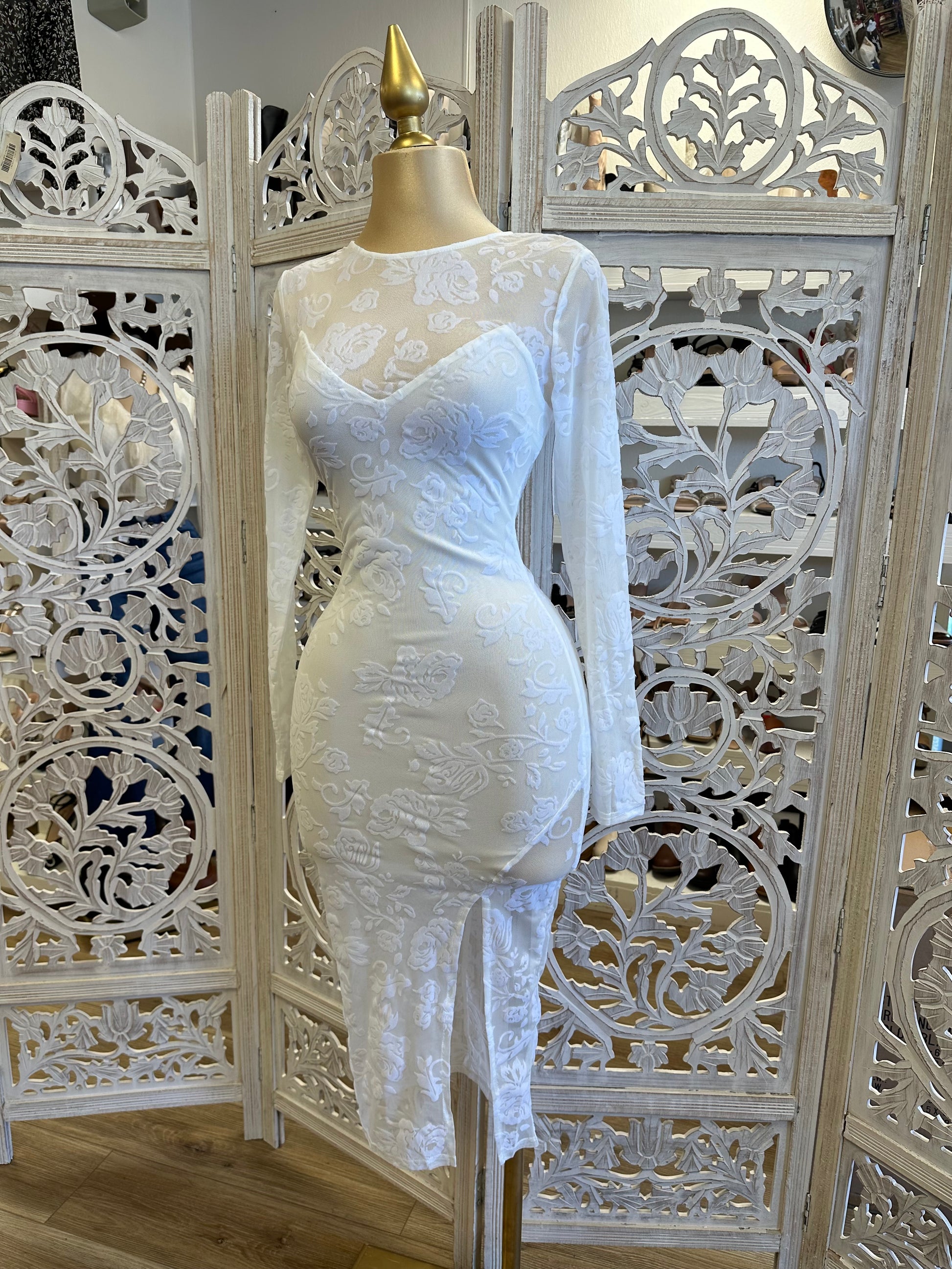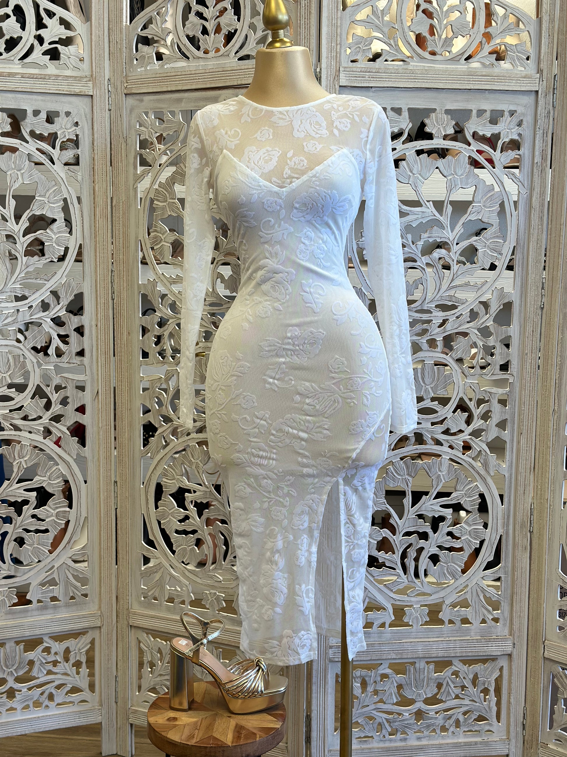 White Flower Mesh Slit Midi Dress- Stretchy